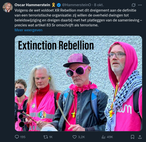 Ok, het bovenstaande plaatje zag ik op X (voormalig Twitter) voorbij rollen op het moment dat ik kotsmisselijk werd van het ontwrichten van het treinverkeer door leden van Extinction Rebellion. Ik had ze in Den Haag van de week ook al zien rondstappen en de politie was daar heel goed op de hoogte en speelde in op de dreiging. Nou ja.... 30 tot 50 man in het park Koekamp en ongeveer 100 - 150 man/vrouw politie in de stad op de been alleen voor dit soort gajes. Ik zeg aanhouden / snelrecht / vastzetten als gevaar voor de samenleving.